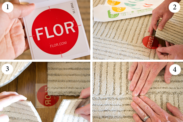 Then, wherever four carpet tiles come together, lift the corner edge of one carpet tile up and stick a FLOR dot to it (sticky side up), using the lines printed on the sticker as your guide. (photo 2)