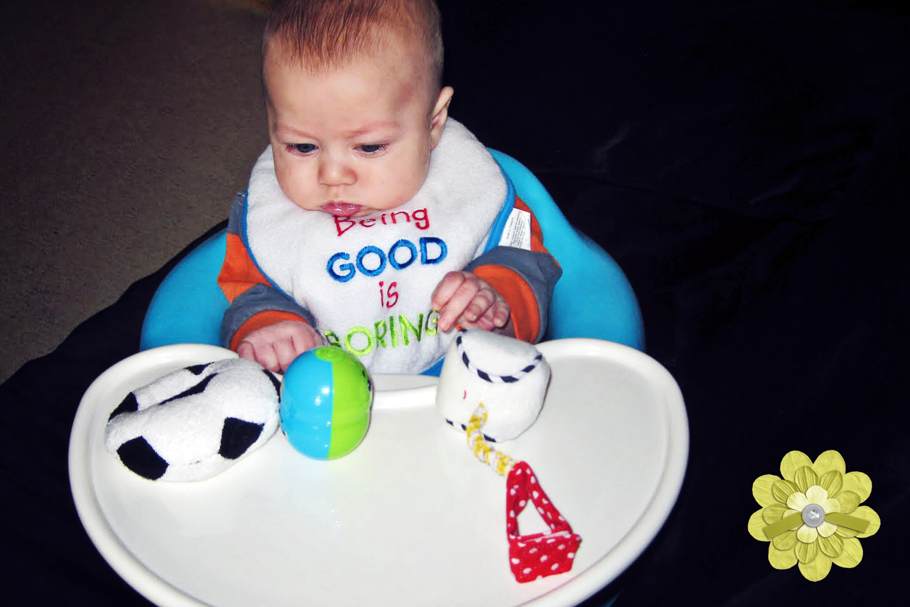 He is just adorable!! What a great idea. When my kids were his age they sat in a boppy.