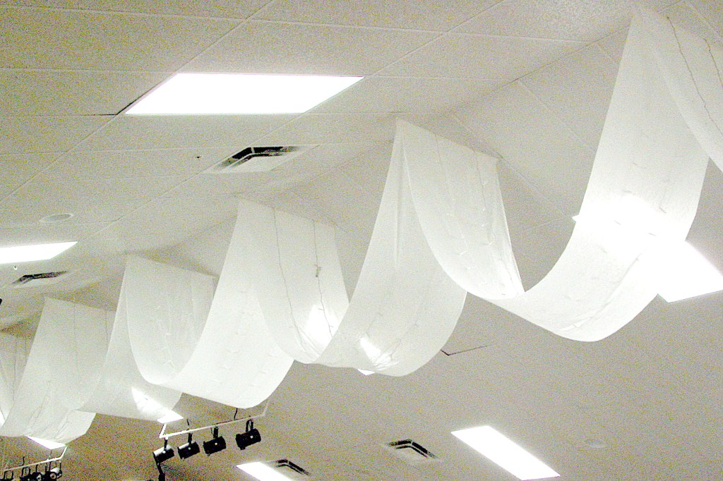 For their ceiling draping effect, they used aisle runners, then added twinkling fairy lights on top of it. It was a wonderful Ceiling Canopy effect to behold!
