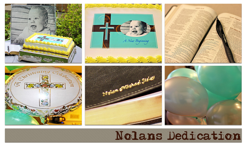 In the image above, you will see snippets of all the cute decor for Nolan’s Dedication Ceremony. The top left corner, the big picture is the 16 x 20 canvas print we had ordered for Nolan s gift, unfortunately we had to leave the plastic covering over it since it was outside. The funny thing was, my daughter used the same picture to have his cake designed with. Neither one of us knew the other one was doing this.♥