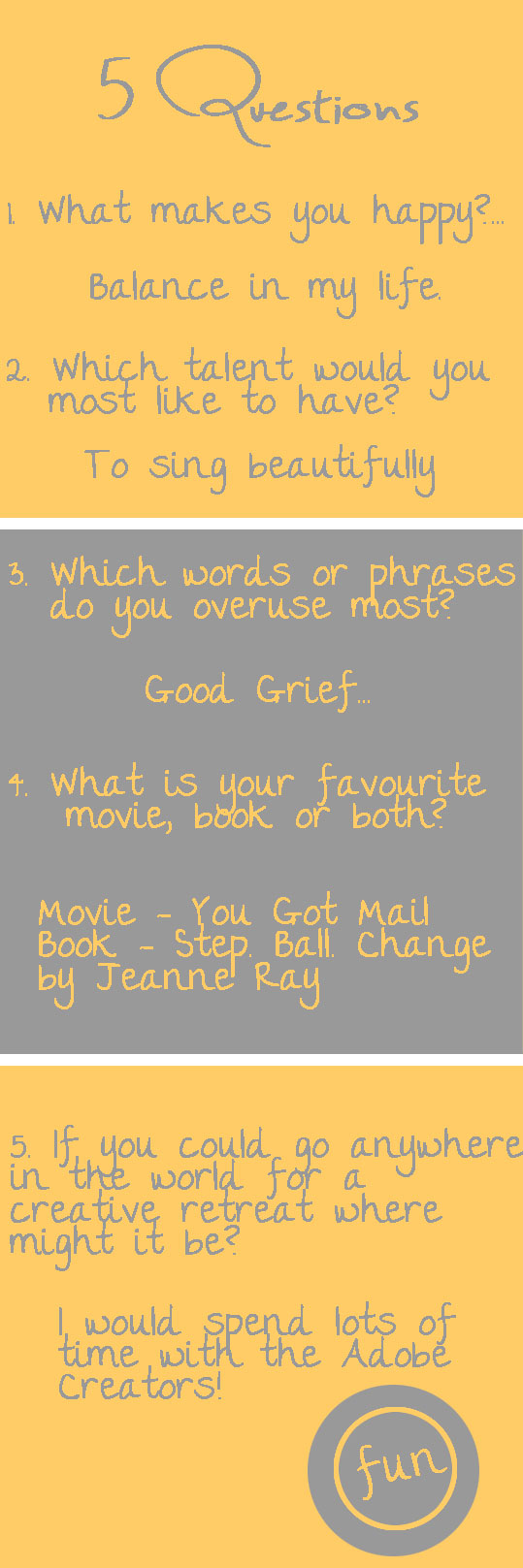 1. Life balance – that is a good one! I would love that myself…and also to be a great singer. People with that gift are so lucky…I’d sing all day long. lol 🙂 Thanks for sharing your answers – I love the way you presented them, too.