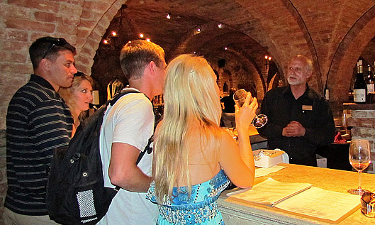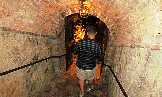 My son-in-law going down the staircase to the dimly lit and very mysterious tasting room.