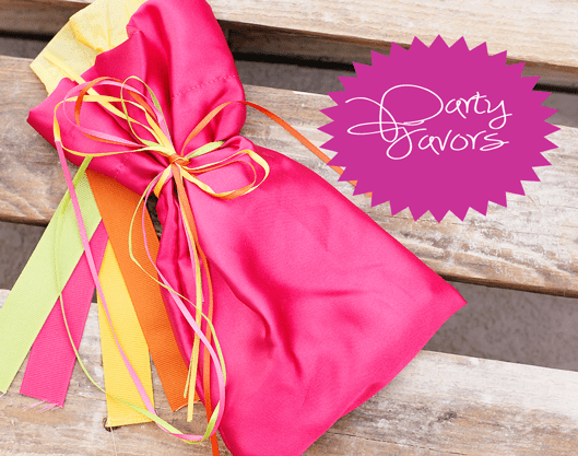 4. Party favor bags are…oh…so…cute. Use satin to sew the favor bag in the main color of your theme. Use the accent colors for the thin ribbons to tie the bags closed. The possibilities are endless what you can use these for….