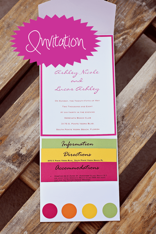 1. This invitation was created using four different colors of card stock. Pretty adorable huh? Use circle punches as the bottom border, using one of each color. Then type out all the necessary information on three different colors of card stock. Keeping each card at varying lengths so it is visible to your guests. Use the main color of the wedding as the frame of the invitation itself.