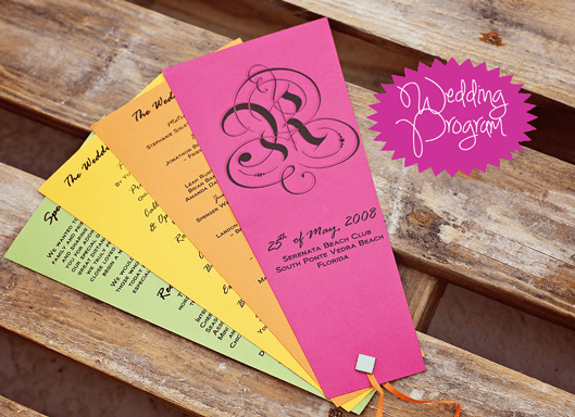 3. Wedding Programs…using the same four colors of card stock…type out all your wedding information for your programs. Cut out in a desired shape. Use a brad to connect all four pieces together along with a thin ribbon. These will hang on the corner of each guest chair.