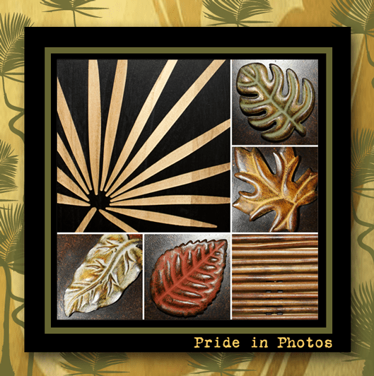 The most important aspect of choosing artwork is finding pieces that express your personality while enhancing the look of a room. Artwork is an accessory that should add interest and sophistication. Be mindful of your color schemes and decorating themes when selecting a good art pieces for a room and look to create balance and harmony with the rest of the room’s contents. Fall flavor artwork is one of my favorite styles of decorating. The bark, lush foliage, and the earth elements bring the outside indoors. Fall Season’s rich color and warm hues make it perfect for all home decor. Metal art is popular right now and can be found everywhere!! I created this collage and background of all the different elements in the artwork, so you could have a close up view. The best way I have found for creating a background is using brushes in Photoshop. These adorable leaf brushes can be found on Mel’s Brush Blog. You know one of the great aspects of having a blog? It lets out your Artsy Fartsy Side…☺