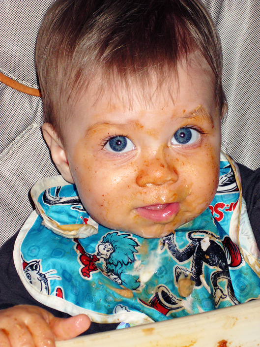 “Little Man” is trying his hand for the first time at spaghetti. Notice his gusto in his first attempts.