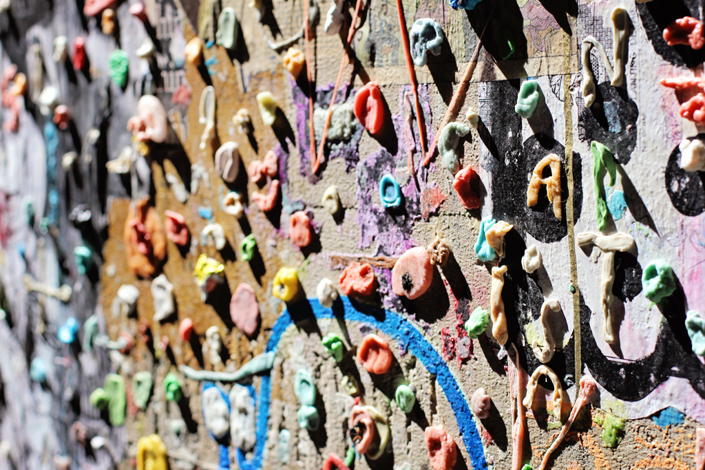 The wall is by the box office for the Market Theater, and the tradition began around 1993 when patrons of Unexpected Productions‘ Seattle Theatresports stuck gum to the wall and placed coins in the gum blobs.Theater workers scraped the gum away twice, but eventually gave up after market officials deemed the gum wall a tourist attraction around 1999. Some people create small works of art out of gum.