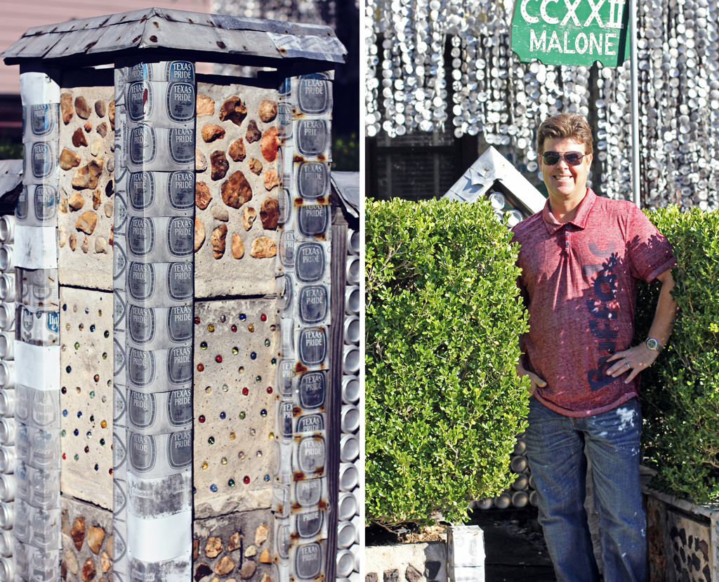 John Milkovisch, a retired upholsterer for the Southern Pacific Railroad, started his project now known as the Beer Can House in 1968 when he began inlaying thousands of marbles, rocks, and metal pieces into concrete and redwood to form unique landscaping features. When the entire front and back yard were completely covered because he “got sick of mowing the grass”, he turned to the house itself and began adding aluminum siding – aluminum beer can siding, that is.